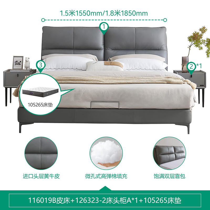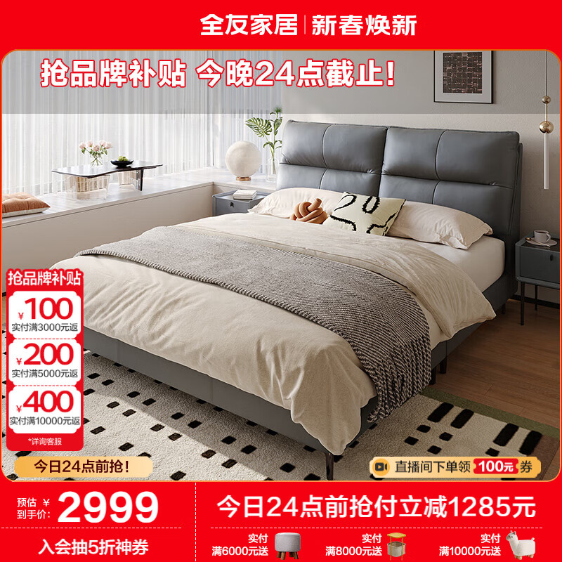 全友家居 头层牛皮现代简约真皮艺软包床1.8x2米主卧室双人大床116019价格:4284.29元!