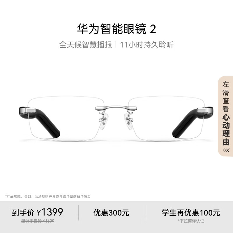 华为智能眼镜 2 无框光学镜 无线双耳立体声/手势控制/长续航/开放式耳机价格:1399.00元!