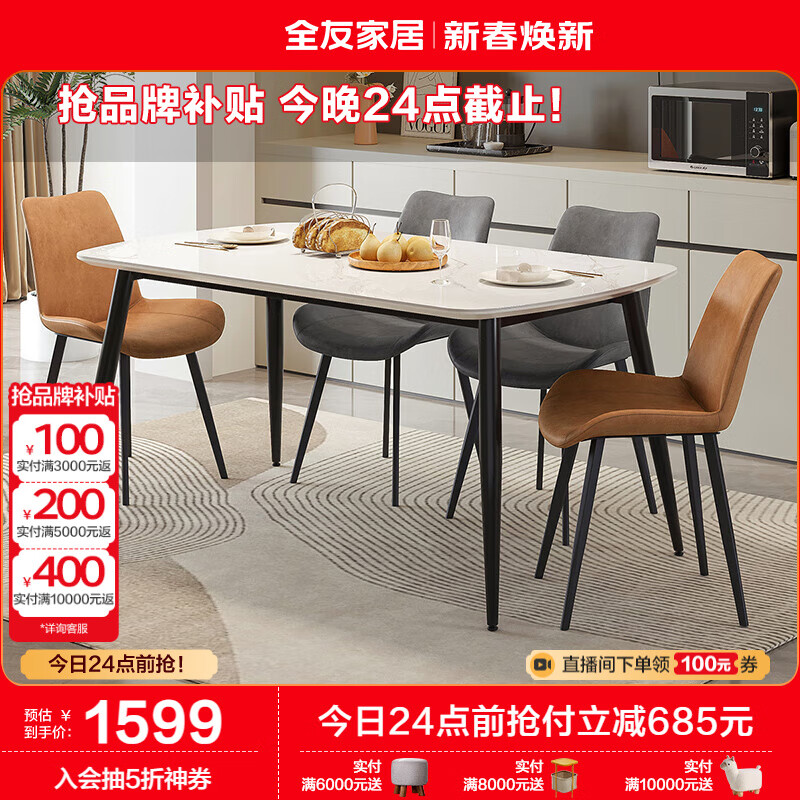 全友家居 岩板餐桌家用现代简约风餐桌餐椅组合吃饭长方形桌子DW1179价格:2284.29元!