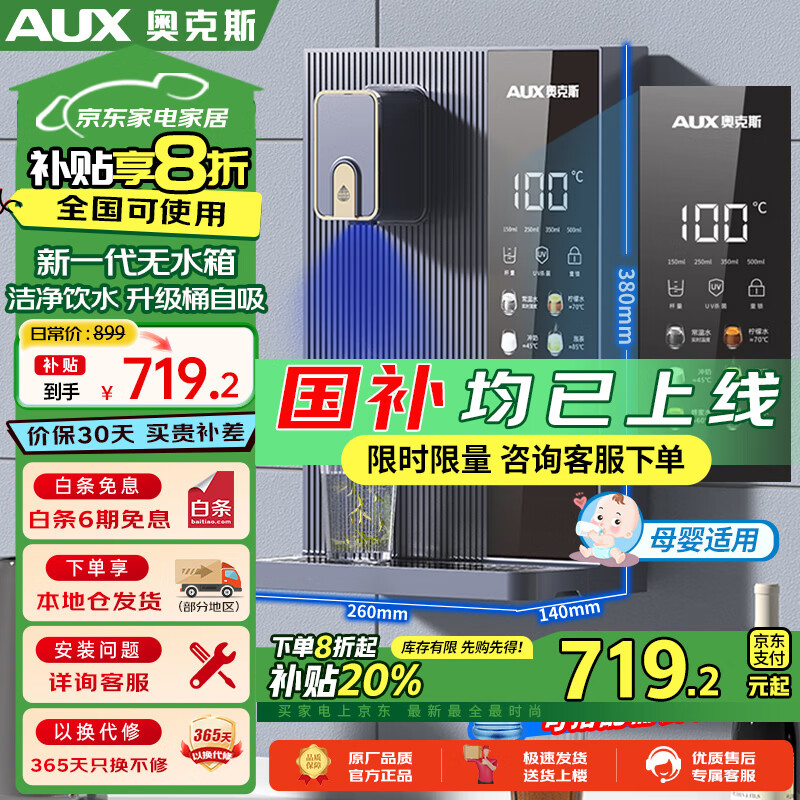奥克斯家用高端净水器净饮机伴侣 壁挂式饮水机 即热即饮 全通量适配 全水路杀菌速热管线机YGX-2201W价格:999.00元!